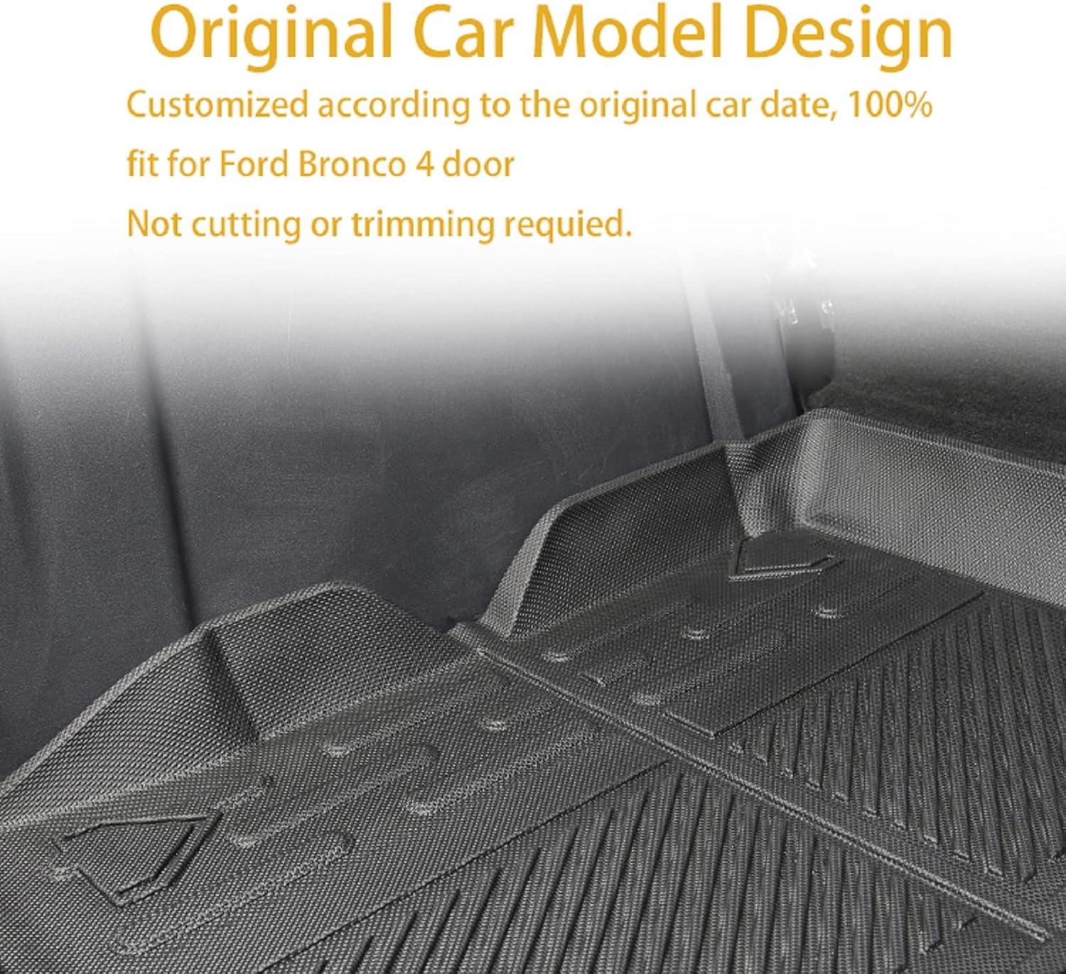 Cargo Liner Provides complete trunk and cargo area protection. Our Cargo Liners are digitally designed to fit your 2021 2022 Ford Bronco (Doesn’t fit 2-doors or Bronco Sport)