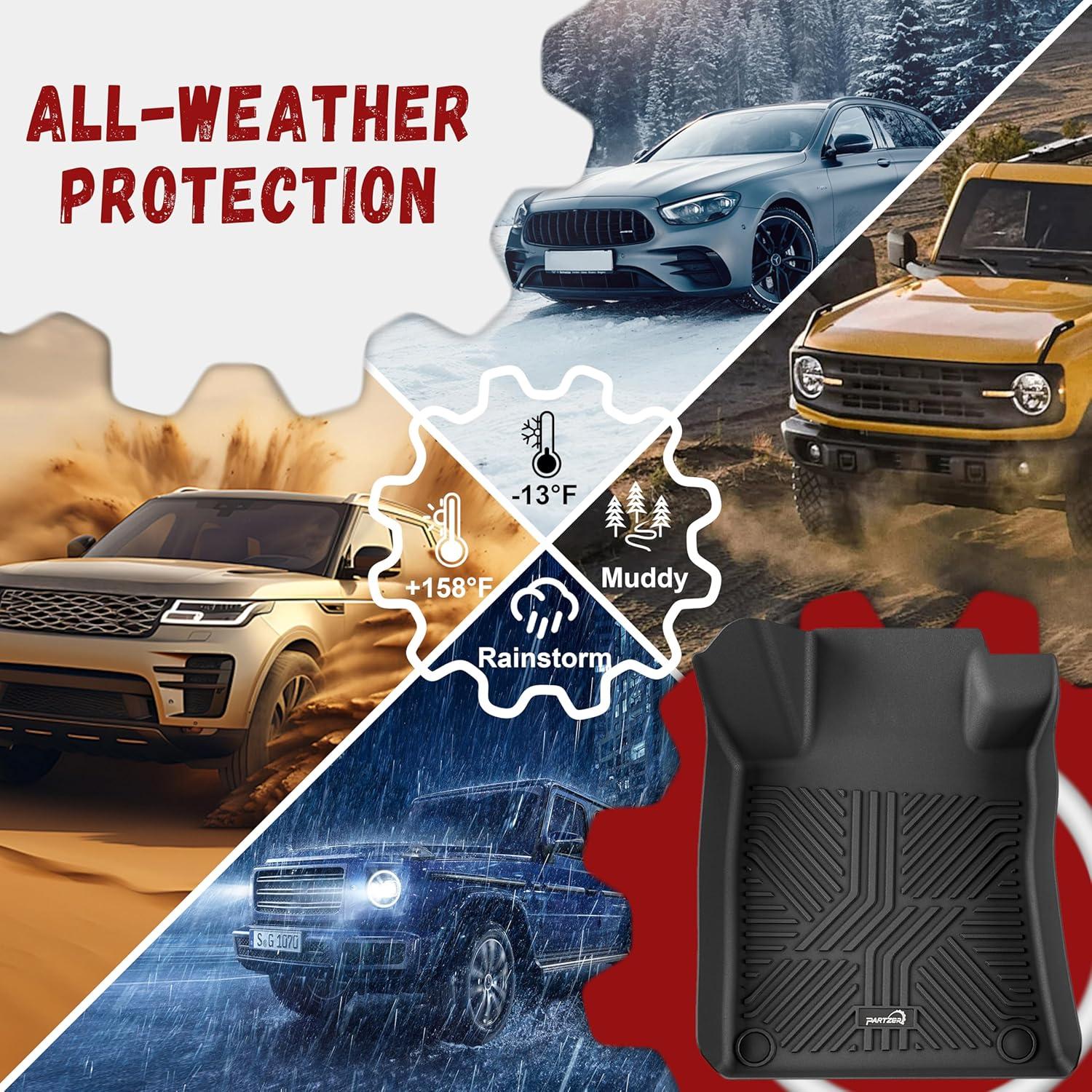All-Weather Protection: Our all weather floor mats provide comprehensive defense against rain/mud/snow/sand, and more. Engineered to withstand any weather condition and driving scenario, they keep your car's floors immaculate.