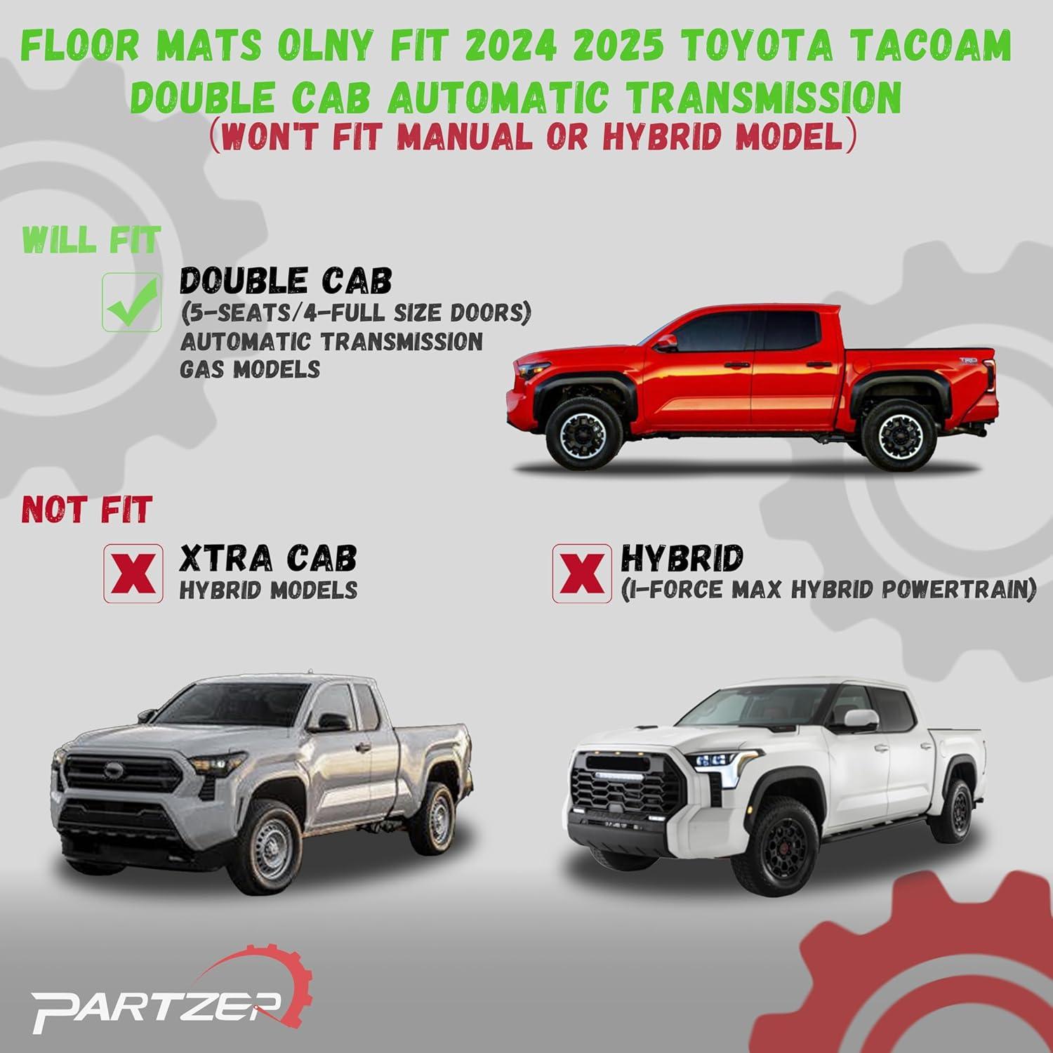 CUSTOM FITMENT : PARTZER Floor Mats Fit for 2005 2006 2007 2008 2009 2010 2011 2012 2013 2014 2015 Toyota Tacoma Double Cab (Only Fit Automatic). NOTE: Only Fit 2005-2015 Tacoma Double Cab(4-Full Size Doors), Not Fit 2005-2015 Tacoma XtraCab/AccessCab (2-doors)