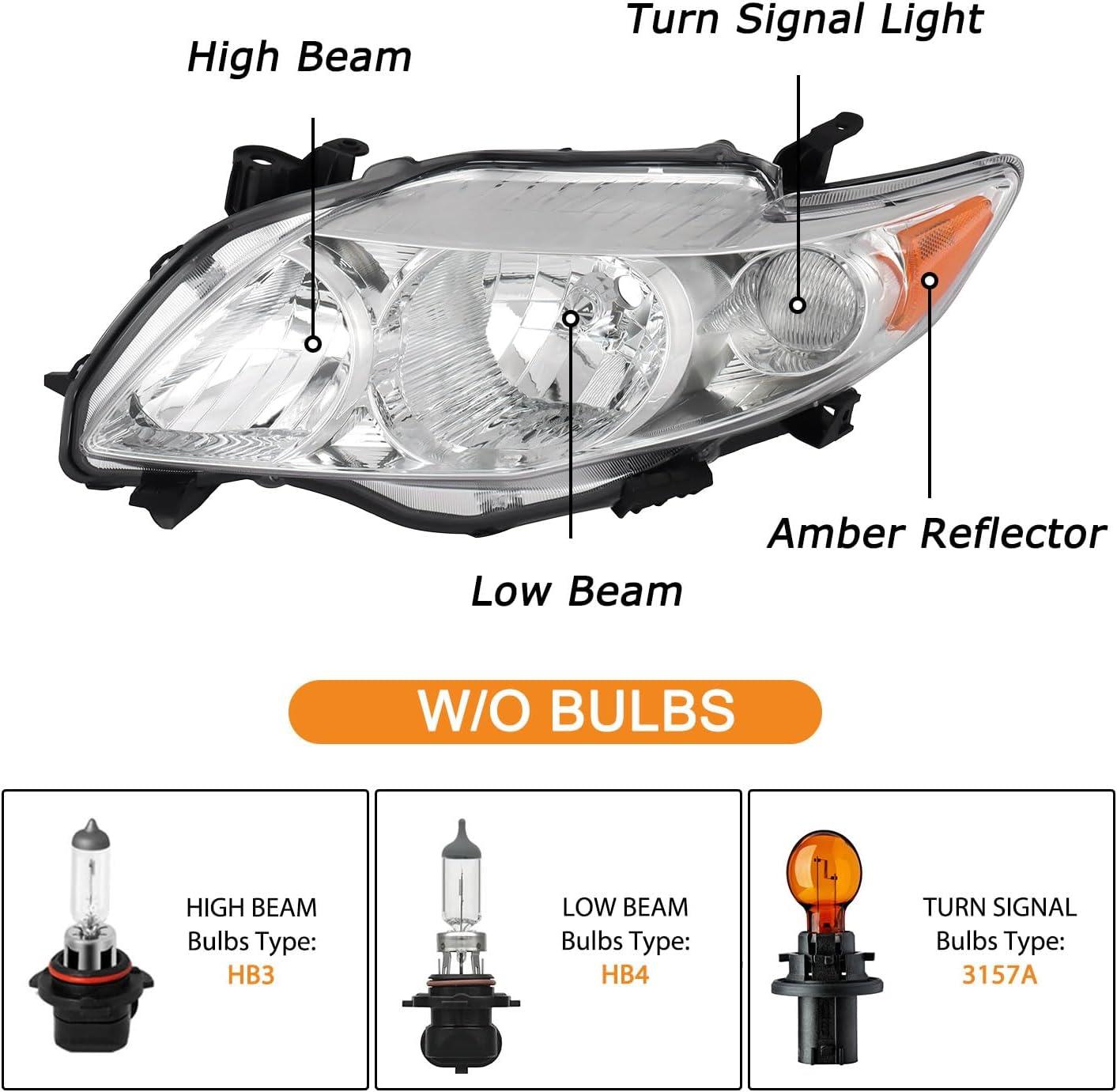 [LIGHTING FEATURES] The reflective halogen lamps of Toyota Corolla gather light through reflectors, the light is even and the brightness is easy to adjust and control. The penetration effect is excellent in heavy rain, fog or when visibility is poor, and the excellent penetration ability of the Toyota Corolla headlamps assembly can provide safety for drivers. NOt:HB3 bulbs : Low Beam 9006 / High Beam 9005 / Turn Signal 3457A (Bulbs are NOT included).